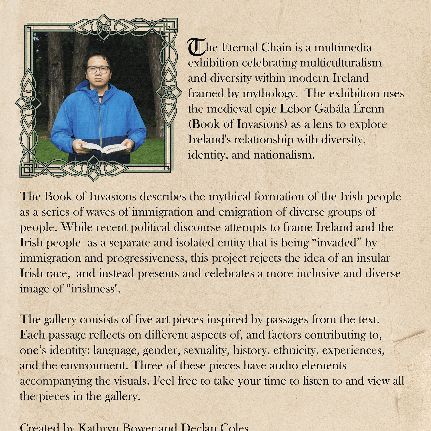 The Eternal Chain combined audio and visual elements to explore modern Irish society and identity framed by mythology. This exhibition examined and celebrated multiculturalism, diversity, and identity within modern Ireland through the lens of the medieval poetry collection Lebor Gabála Érenn (Book of Invasions).